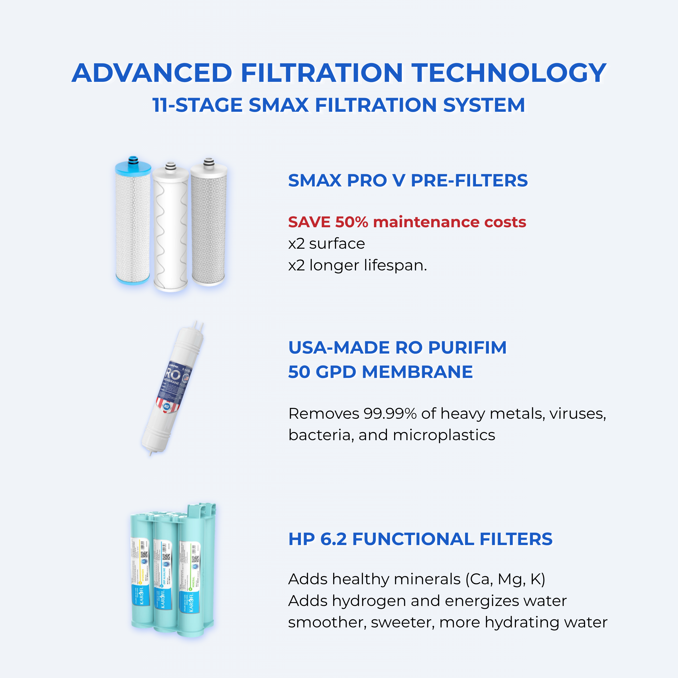 ✅ Filtrasi Smax 11 Tahap yang Kuat – Menggandakan efisiensi dan masa pakai filter; termasuk membran RO buatan AS (50 GPD) dan pra-filter Smax Pro V